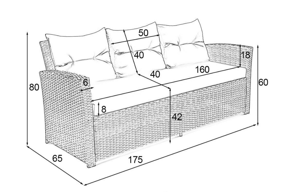 Trīsvietīgs dīvāns: platums 175 cm; dziļums 65 cm; augstums 80 cm;