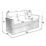 Dīvāns: platums 158 cm; dziļums 60 cm; augstums 81 cm;