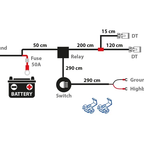 Informācija: HD Vadu komplekts divām gaismām. 12V relejs, 320W max. Gaismu vadi 2.5m, pilns vadu komplekts no akumulatora līdz gaismām. Drošinātājs 30A. Vadi -40C – +150C.