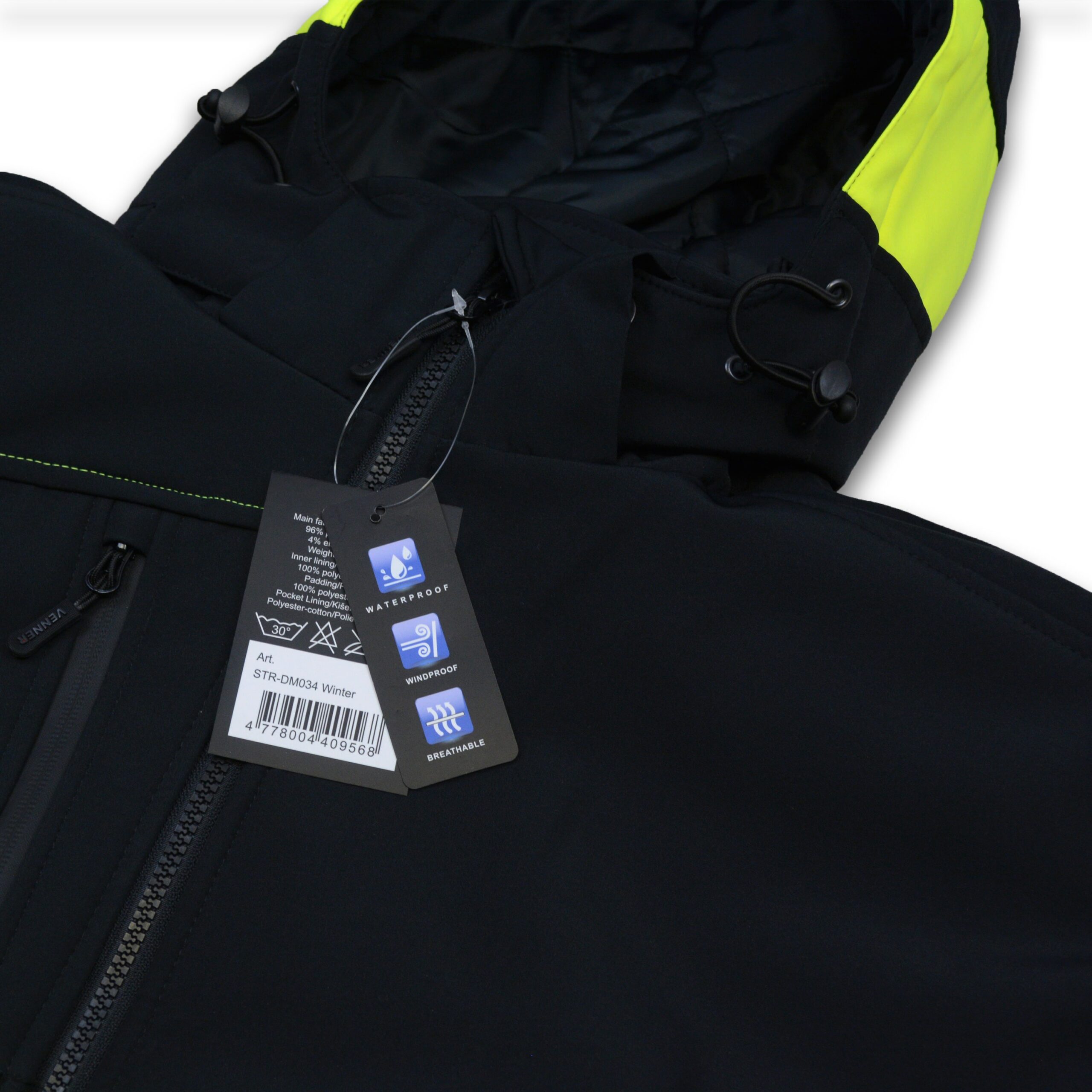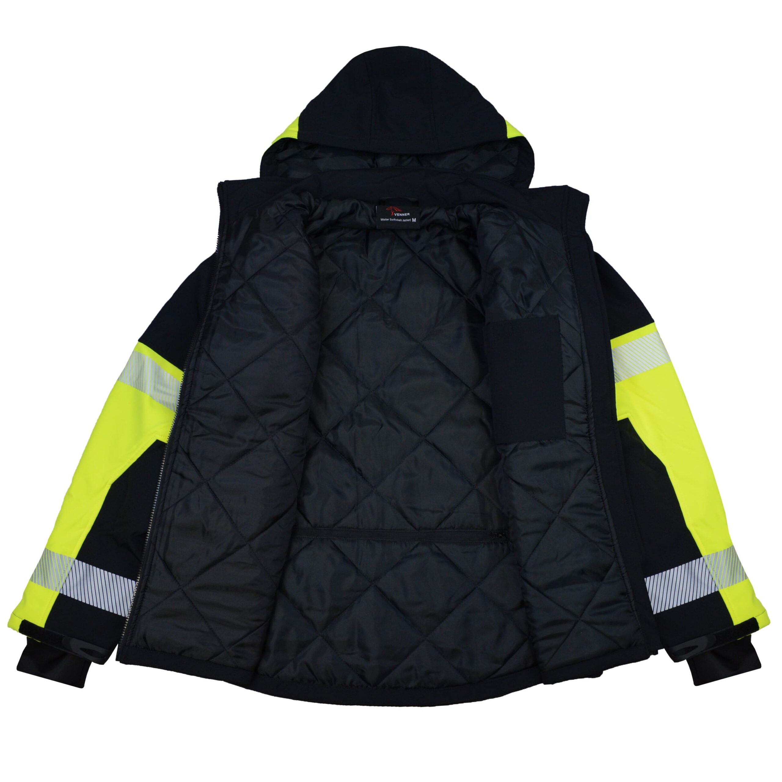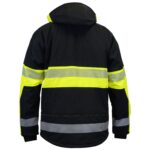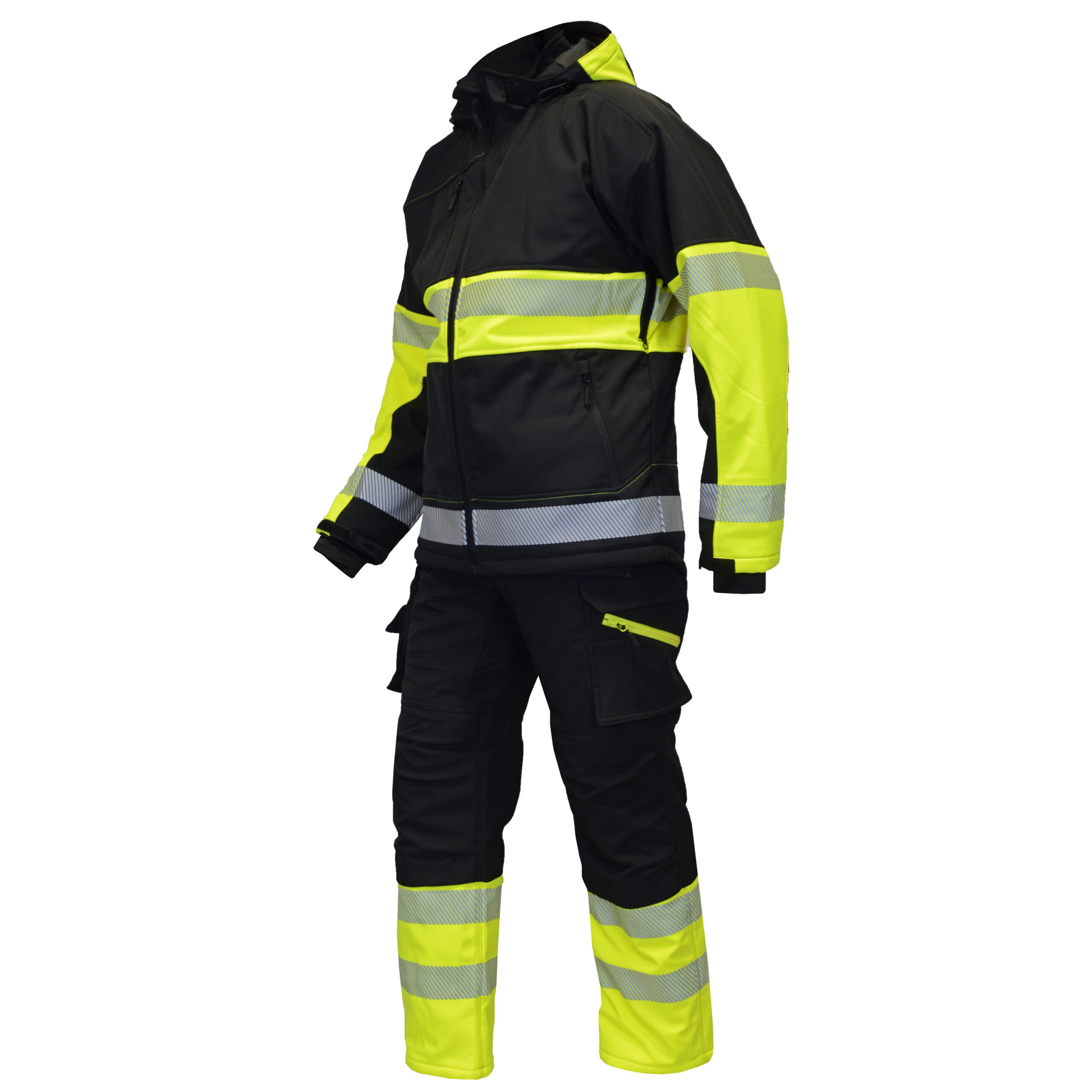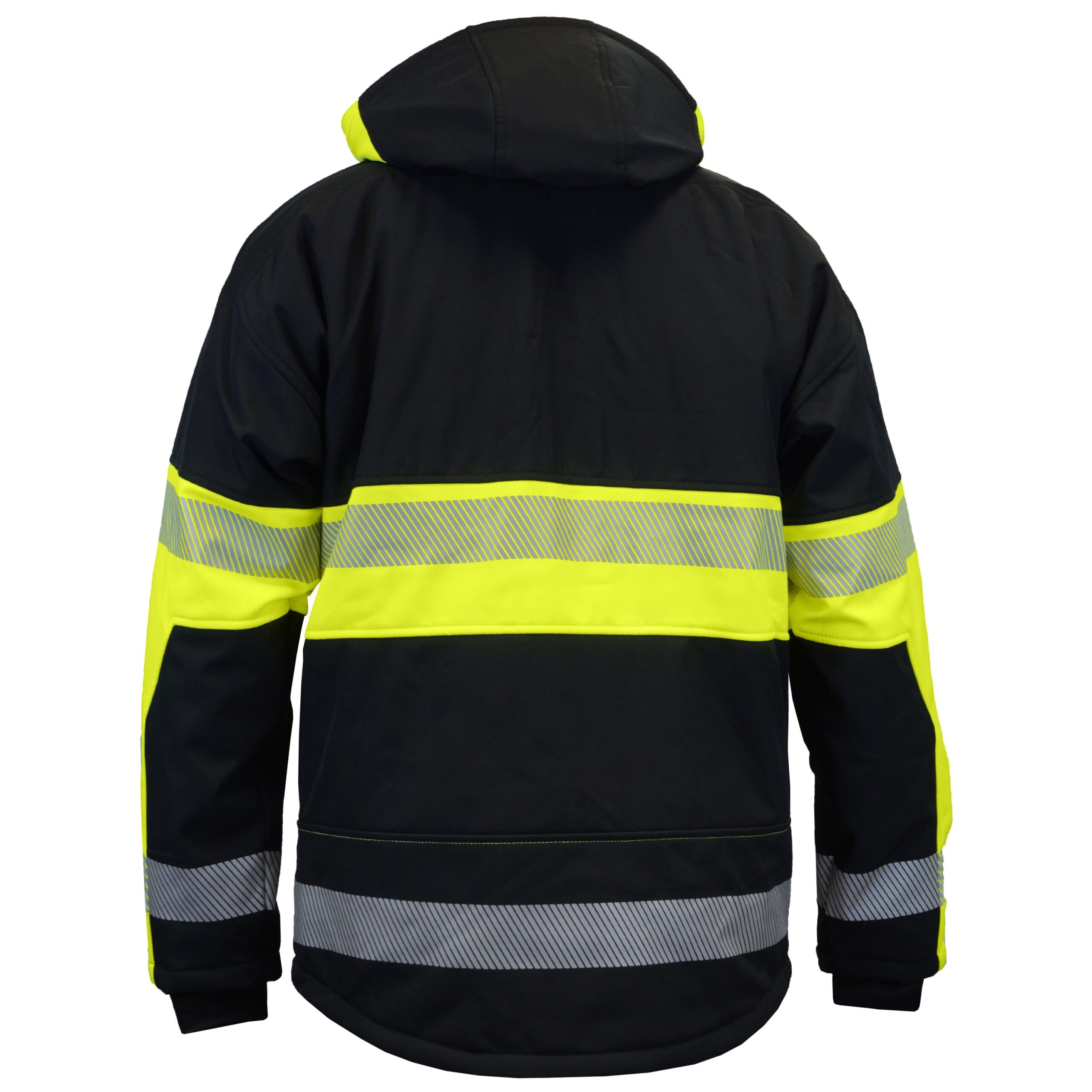 Melna ziemas Softshell jaka Reflex ar augstas redzamības atstarojošām svītrām. Ārējais softshell materiāls ir mitrumizturīgs.